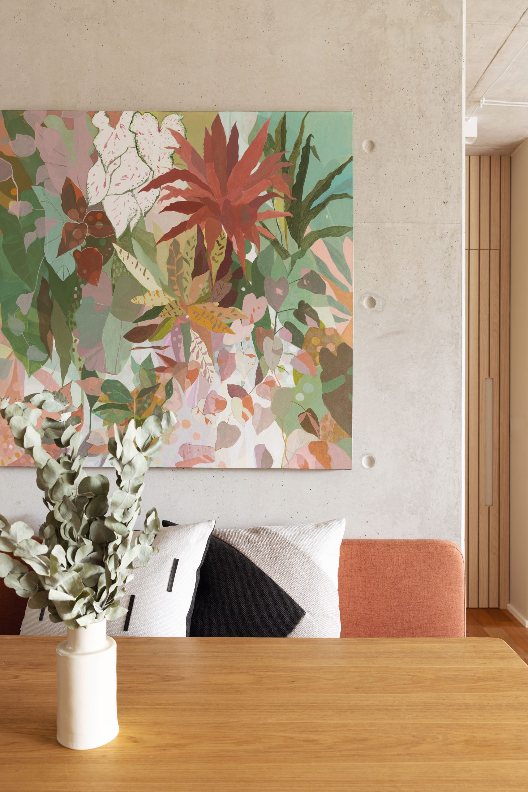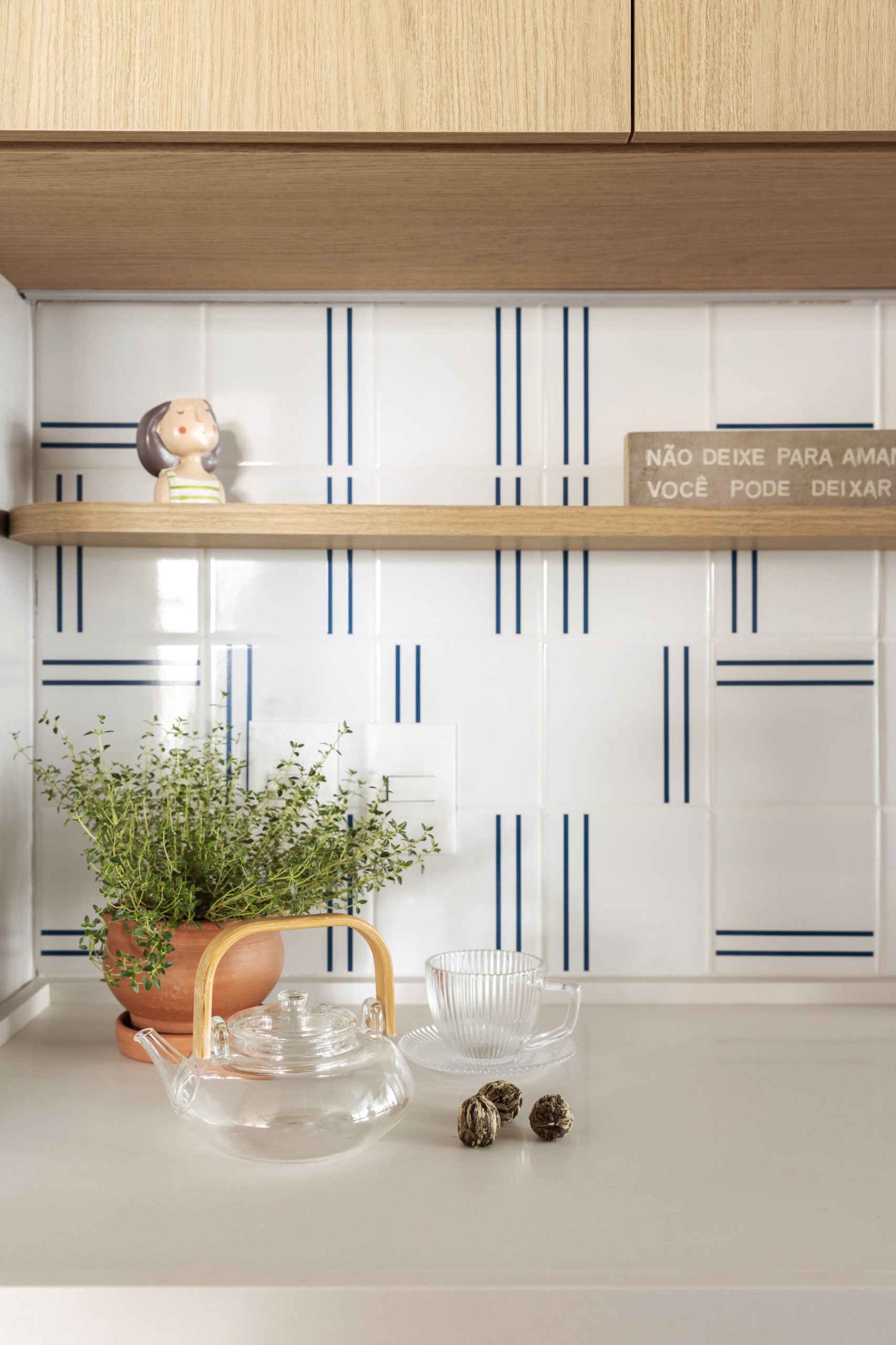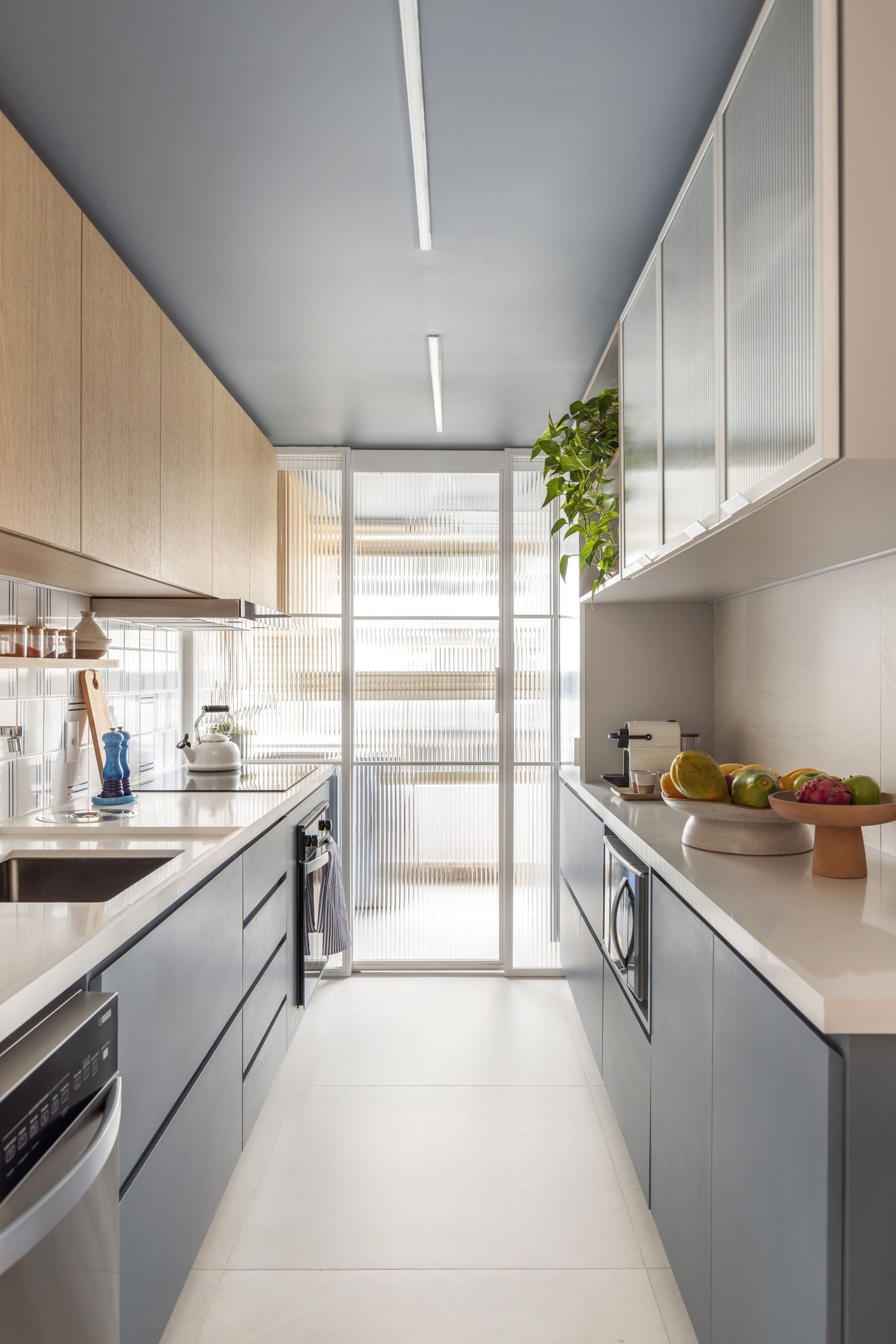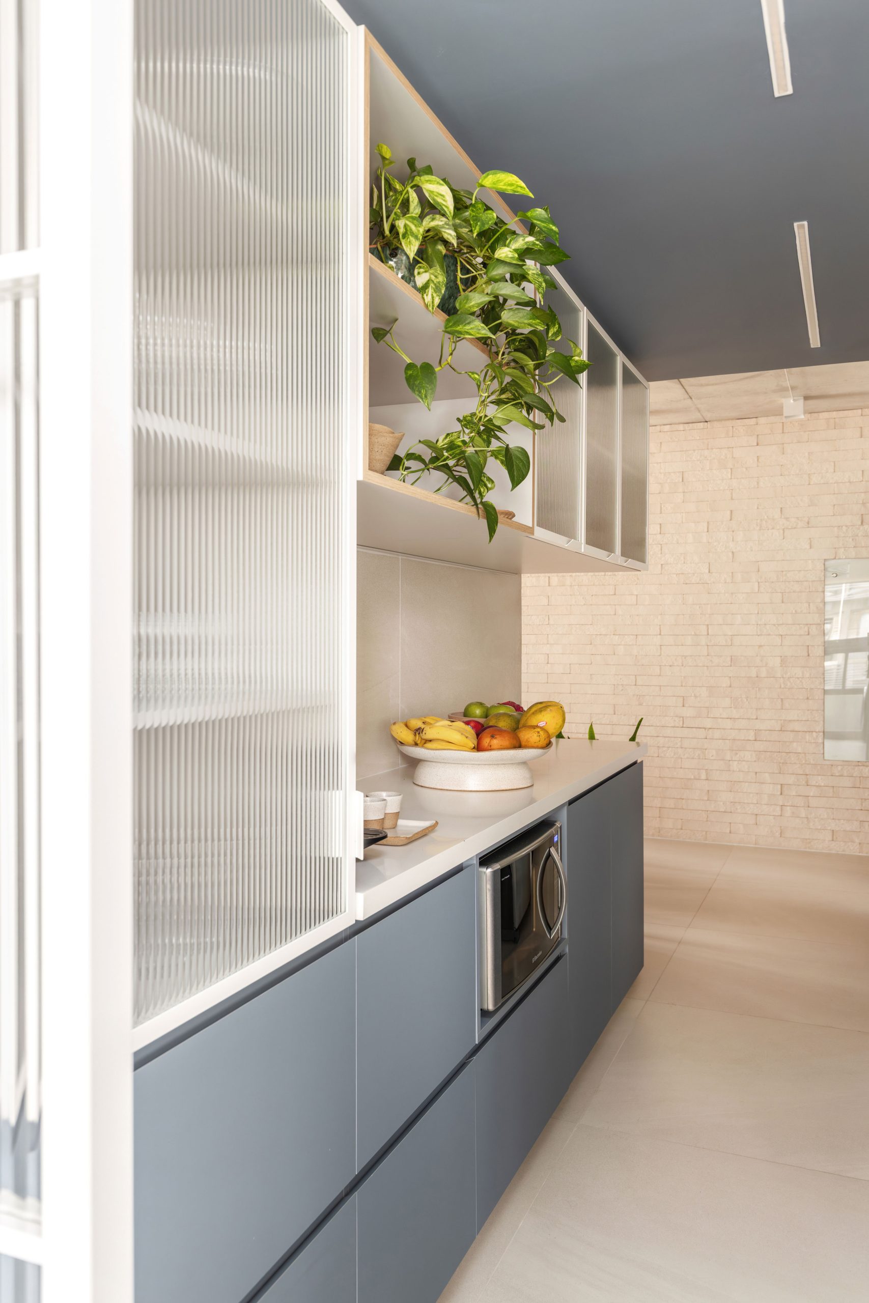 Na área social, iluminação, climatização e cortinas são automatizadas trazendo comodidade no dia a dia. Cozinha e sala foram integradas para manter fluidez, característica desse modelo de apartamento. Todas as escolhas de revestimentos, texturas e cores visaram frescor e ampliação do espaço.